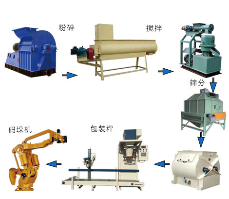 由原料仓、螺旋输送机、人机界面、PLC(可编程)、自动计量称重模块、斗式提升机、双轴无重力混合机、成品仓、自动称量包装机、脉冲除尘器、支架爬梯平台、电气控制柜等组成。